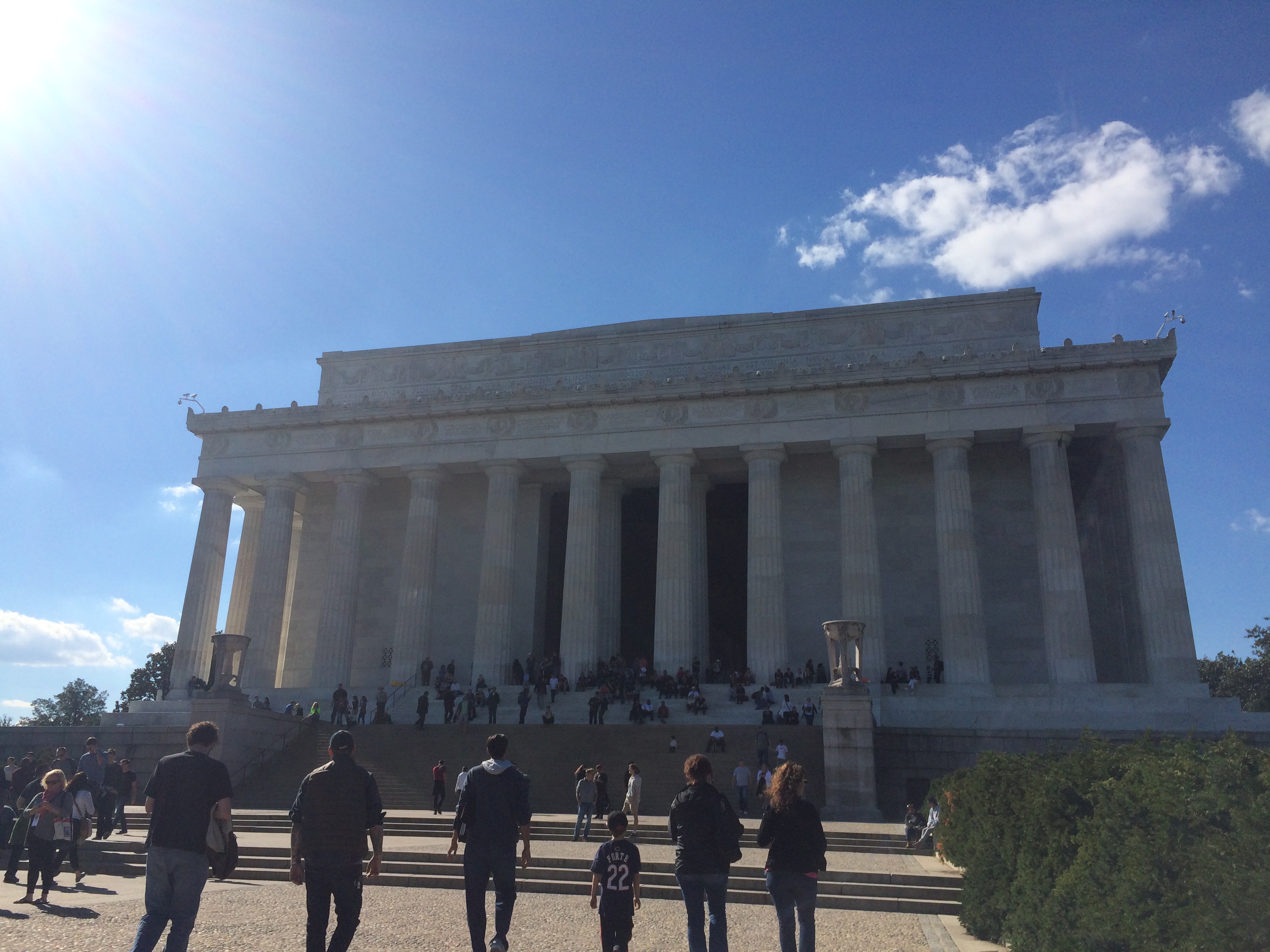 Another Monument we went to was the Lincoln Memorial. Considering we learned a lot about Abe yesterday it was cool to see this statue of him. The whole Monument has 36 columns surrounding “Honest Abe” representing the 36 states that where established in the time the he was elected. He was the 16th president to be elected. He was also considered on of our “best” presidents. It was him who had a major roll in stopping slavery and that is one reason of many why we honor him. This monument opened to the public in 1922.